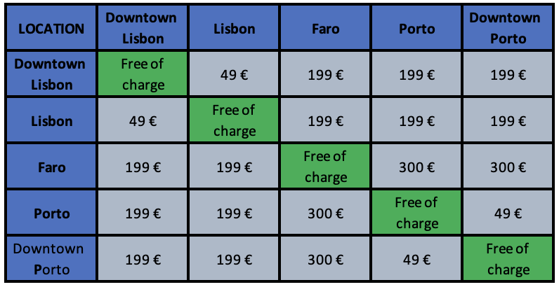 3.9 The Returning of the vehicle in any other Klass Wagen Agency than the one where the vehicle has been taken from, is possible only with the prior written consent of the LESSOR that the transfer is possible. For this service called “One Way Rent”, a transfer fee will be applied depending on the Klass Wagen Agency in which the Returning of the vehicle will take place and the Klass Wagen Agency from which the vehicle has been rented. The fees for this service are presented in the table below: